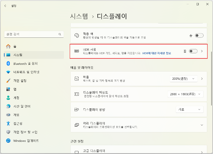 HDR을 활성화하면 HDR 콘텐츠를 보거나 HDR 지원 디스플레이에서 더욱 풍부하고 생생한 이미지를 경험할 수 있습니다. 간혹 HDR의 영향으로 글씨가 뿌옇게 보이는 경우 해제를 통해 해결할 수 있습니다.