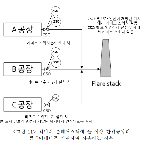 (6) 하나의 플레어스택(Flare stack)에 둘 이상 단위공정의 플레어헤더(Flare header)를 연결하여 사용하는 경우로서 각각의 단위공정 플레어헤더에 설치된 차단밸브의 열림·닫힘 상태를 중앙제어실에서 알 수 있도록 조치한 경우(<그림 11> 참조)